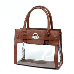 Clear PVC Tote - PU Leather Trim Accent w/ Fold Down Lock - Brown